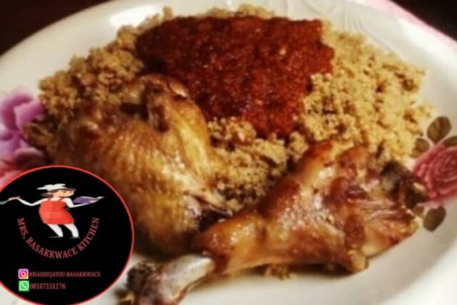 bayan minti talatin ki sauke ki tafasa nama da kayan ɗanɗano ki yanka gutsi gutsi ki gyara busasshan kifin ki ki zuba akan tsakin da kika turara shi da nama da kika yanka gutsi gutsi, ki yanka karas da kabeji. green pies,da Albasa sai ki zuba a kai ki zuba markadadden kayan miyan ki akai amma ba da yawa ba yadda zai jika tsakin ba, ki sa maggi, gishiri, da curry, ki juya sossai, ki mayar kan wuta ki kuma turarawa, idan yayi laushi sai ki sauke, idan yayi tauri ki yayyafa ruwa. yana da dadi zaki burge mai gida da shi, zaki iya yiwa masa a matsayin tuwon rana ki hada masa da salad ɗin hanta da lemon kan kana. ranar sai ya baki lambar yabo