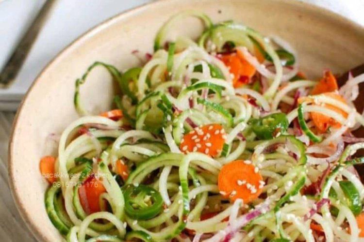 Da fari aunty na za ki samu tukunyar ki ki ɗauraye ki zuba ruwa ki ɗaura kan wuta,ki rufe in ta tafaso kisa taliyar ki jujjuya, ki ɗauko yankakken karas ɗinki da kika kankare masa baya kika wanke kika yanka ki zuba,ki rufe tukunyar ki zuba ki rufe ya tafaso tare ki juye a matsami ki ɗauraye, se ki ɗauko bowl ki juye ki karwo yankarkan kokumber ki ki zuba ,ki ɗauko kantum ki zuba,ki ɗako yankakkar albasar ki ki zuba,ki ɗauko koren tattasan ki ki zuba,ki sa magi kaɗan da ɗan gishiri ki zuba mai iya yanda kike so ki juya sai ci.
