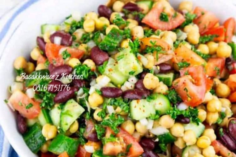 Da fari aunty na zaki ɗauko cans chickpeas ɗinki ki zuba a cikin bowl,se ki kawo can kidney beans ki zuba,se ki ɗauko yankakkiyar cucumber ki ki zuba,se ki ɗauko yankakken tumatur ɗin ki ki zuba,se bunch fresh parseley ki zuba,se juice of lemon,se ki kawo olive oil cokali biyar ki zuba,se spanish onion ,se ɗan gishiri sabida da ɗan ɗano,se black pepper,ki cakuɗa ki jujjuya se ci